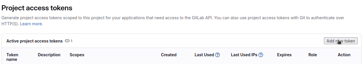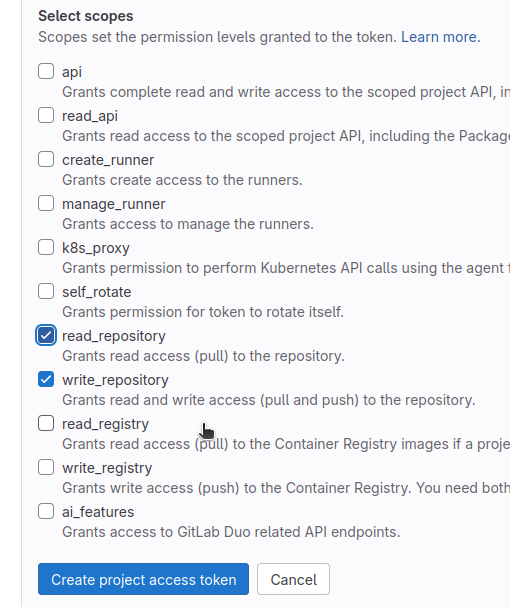 read_repositoryandwrite_repositorypermissions to be able to clone and push our files. Then click on “Create project access token”.